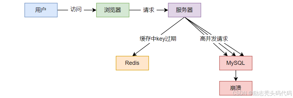 给某一个key设置了过期时间,当key过期的时候,恰好这时间点对这个key有大量的并发请求过来,这些并发的请求可能会瞬间把DB压垮。