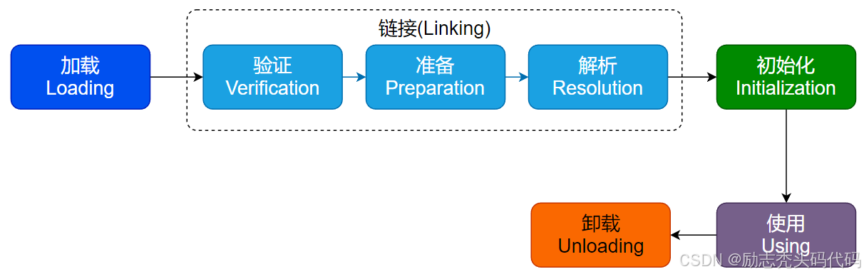 一个类型从被加载到虚拟机内存中开始,到卸载出内存为止,它的整个生命周期将会经历加载(Loading)、验证(Verification)、准备(Preparation)、解析(Resolution)、初始化(Initialization)、使用(Using)和卸载(Unloading)七个阶段,其中验证、准备、解析三个部分统称为链接(Linking)。