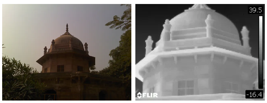 上面两个图像是可见的,它是对应的热图像,你可以看到热图像有点被裁剪掉了。 这是因为在热图像中并没有捕获整个场景,而是将额外的细节作为元数据存储在热图像中。