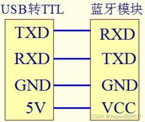 USB转TTL和蓝牙模块连接(蓝牙模块接四根线即可,另外两根不用管),如下图所示。