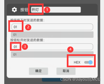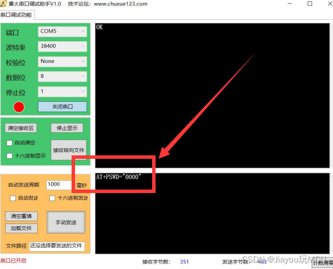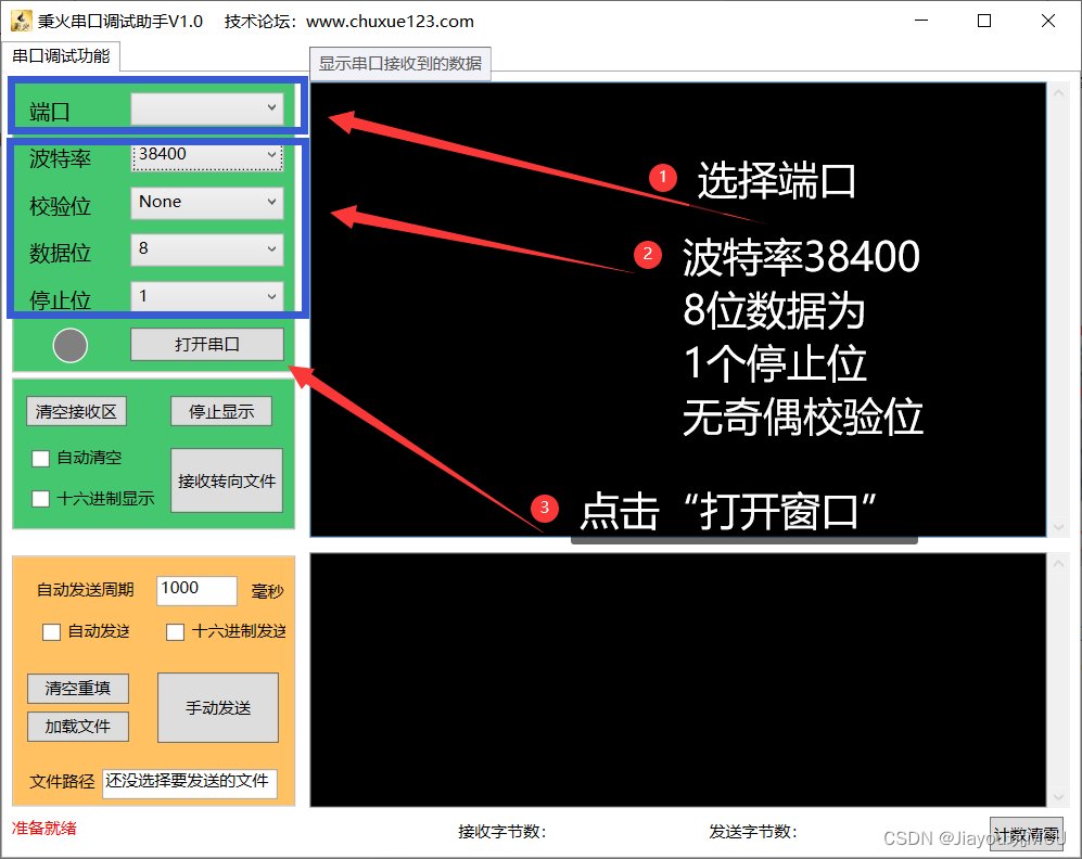 (这里以野火的为例,用其它的也行。本教程串口调试助手在文末可自行获取),①选择蓝牙模块连接的端口(不知道可以到设备管理器查,CH340那个就是),②修改:波特率为 38400,8 个数据位,1 个停止位,无校验位。③然后点击“打开串口”。如下图所示: