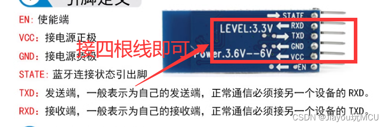 注意:蓝牙模块的 VCC 只能接 5V,不能接 3.3V!(接3.3V供电不足,工作会不正常。)