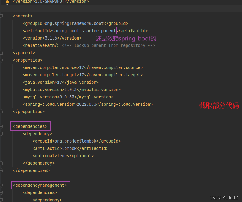 - dependencyManagement :只是声明依赖,并不实现Jar包引⼊.如果⼦项⽬需要⽤到相关依赖, 需要显式声明.如果⼦项⽬没有指定具体版本,会从⽗项⽬中读取version.如果⼦项⽬中指定了版本号,就会使⽤⼦项⽬中指定的jar版本.此外⽗⼯程的打包⽅式应该是pom,不是jar,这⾥需要⼿动使⽤ packaging 来声明.