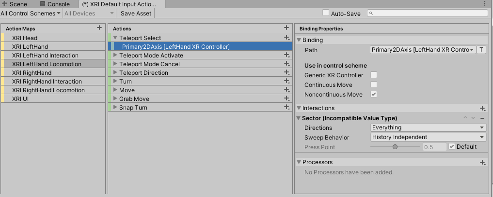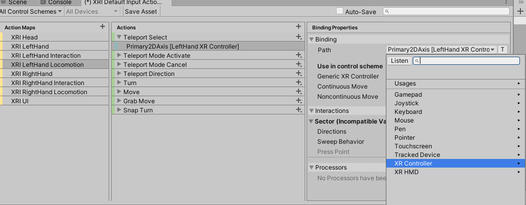 这里设置绑定选项了,图中是一个2d的向量轴,意思是传送射线激活(Teleport Select)会通过一个2d向量(Primary2DAxis)设置