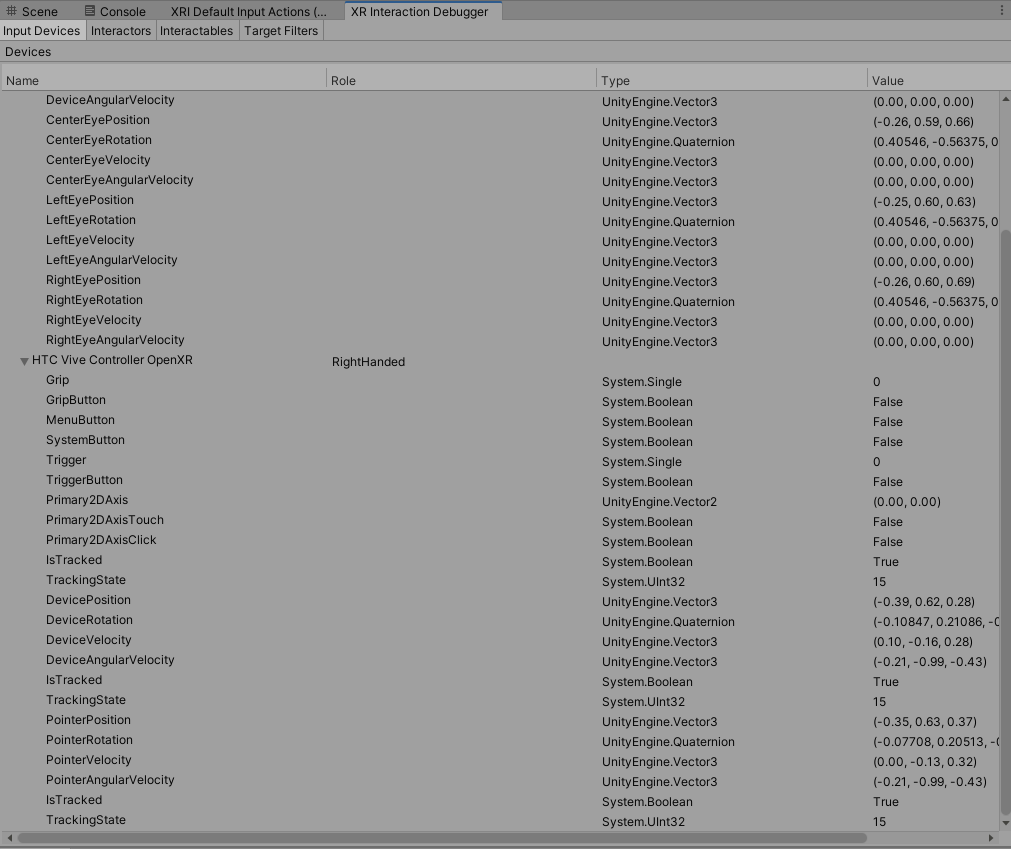 这里有很多选项,新手并不好选,因为部分值看起来很多很杂乱,这里有一个可以debug当前设备输入的工具,可以根据数值变化绑定路径Window->Analysis->XR Interaction Debugger,需要勾选Input Devices选项,同时这里也可以查看正在交互的物体和交互器