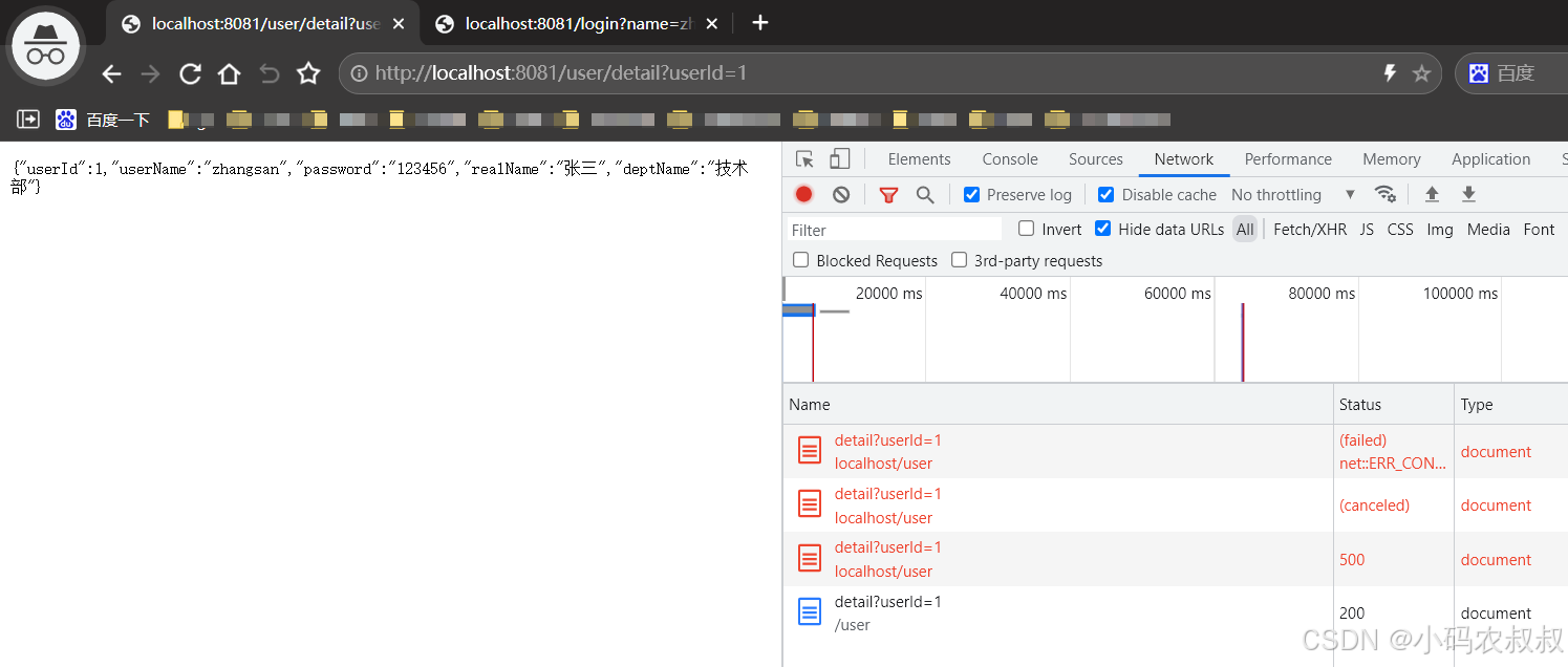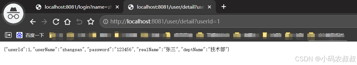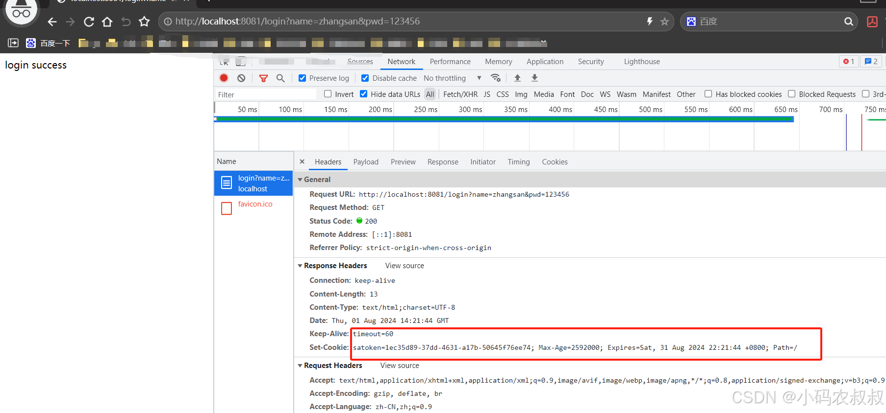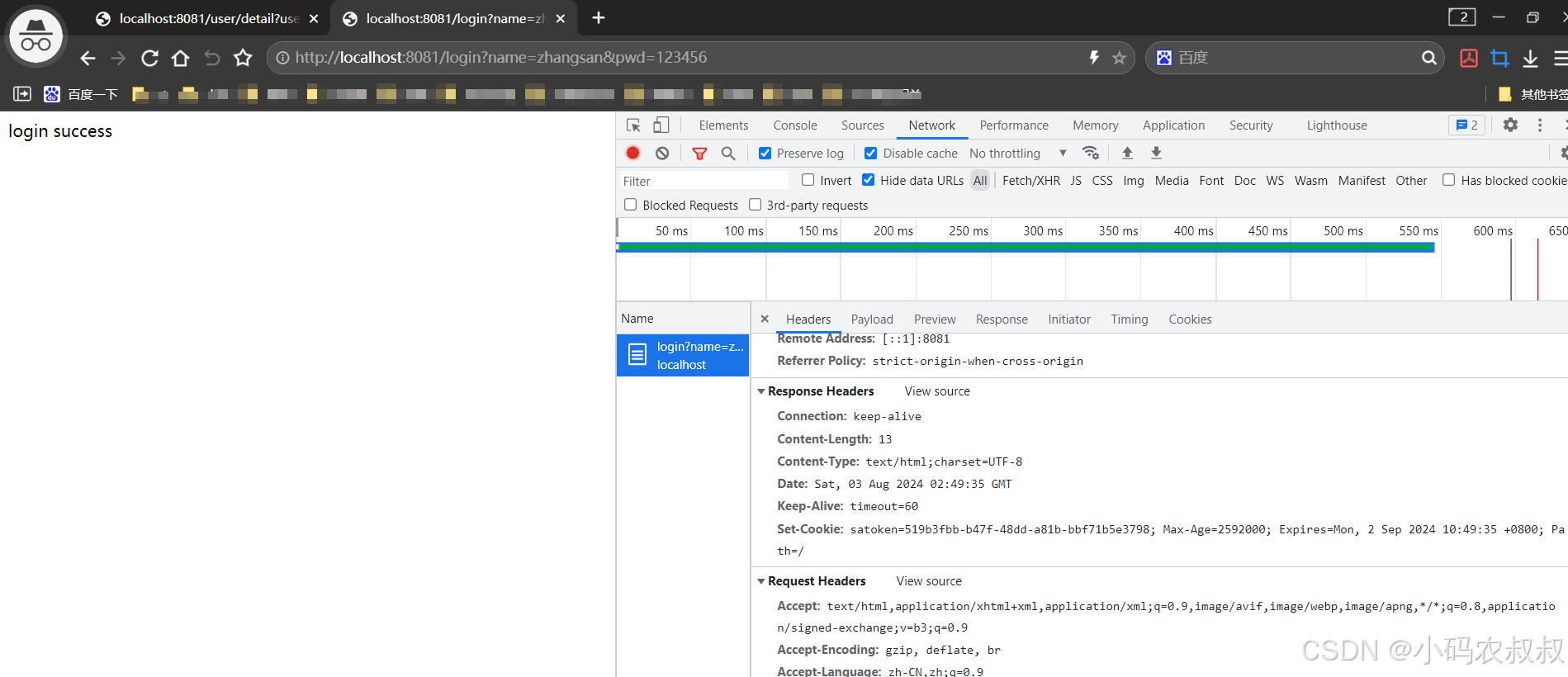 启动工程之后,首先调用登录接口:localhost:8081/login?name=zhangsan&pwd=123456,看到如下效果: