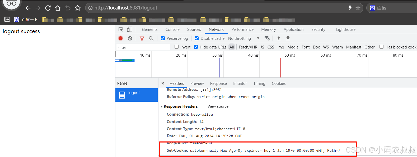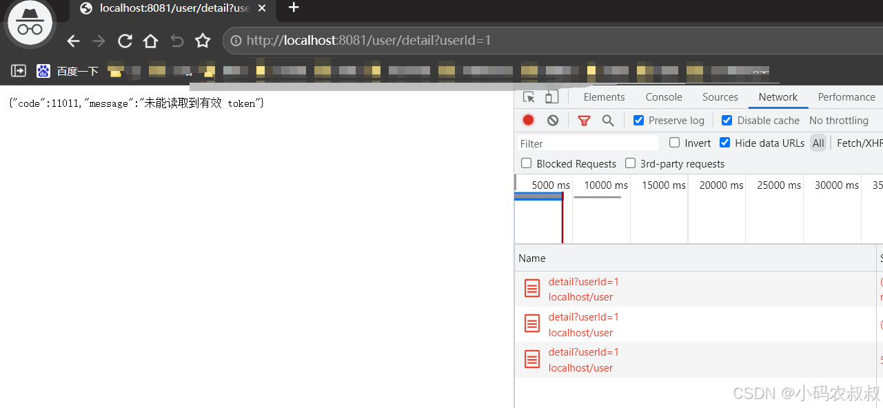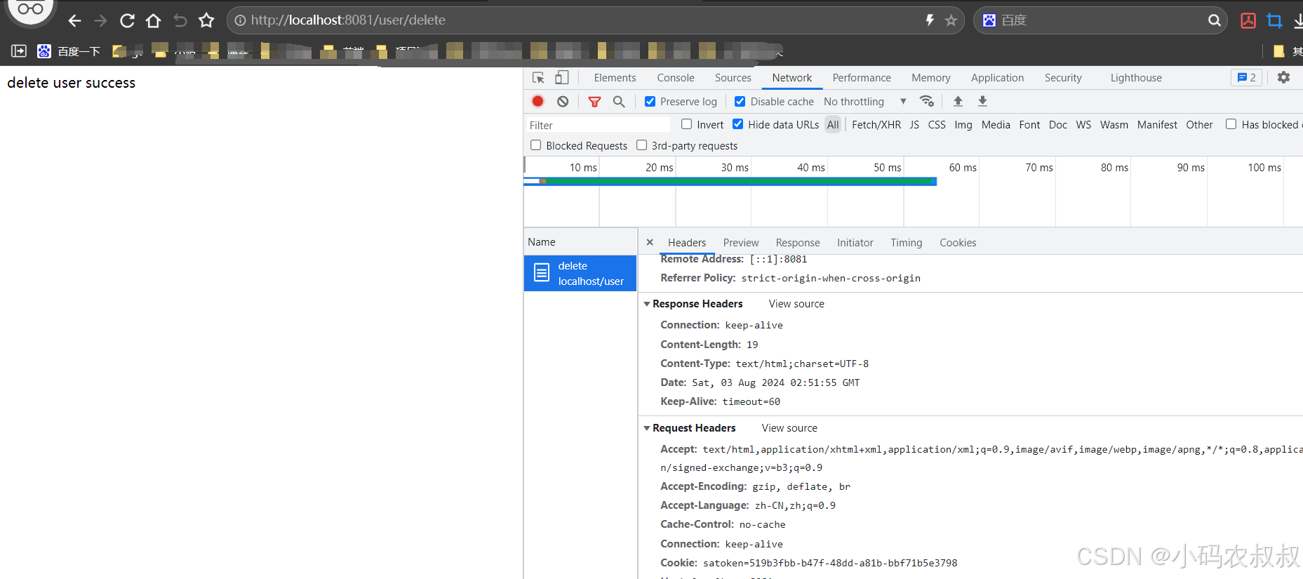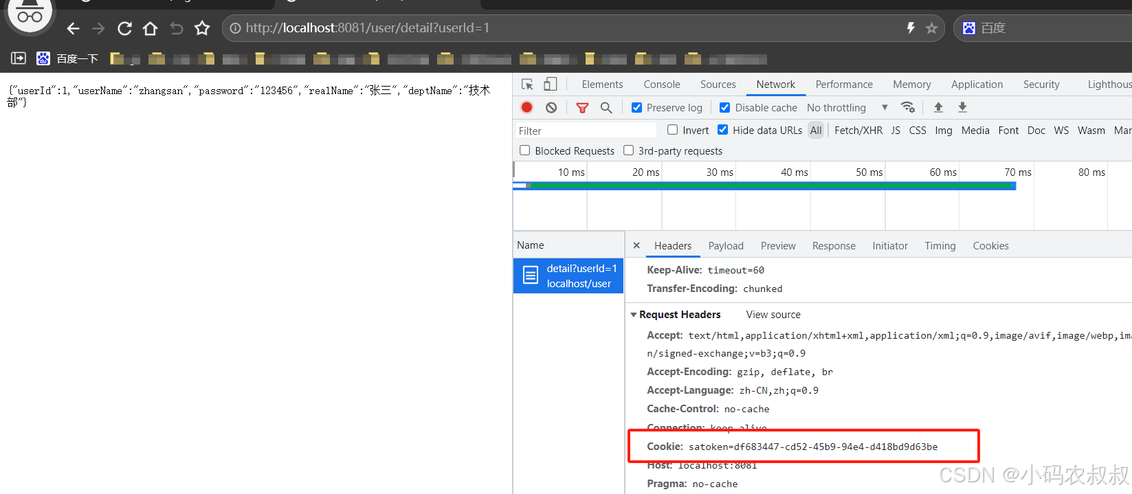 F12查看请求信息时可以发现在本次的请求中,在请求的header中自动带上了cookie的信息,这样服务端就可以从请求中解析出token,进而做请求的拦截和解析等工作