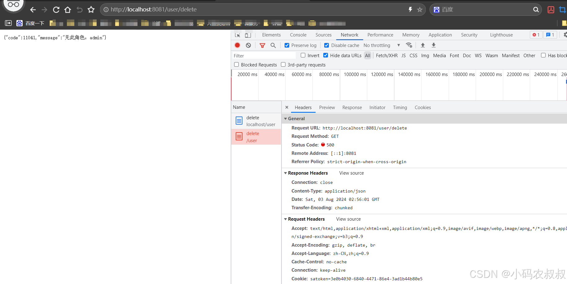 由于lishi这个账户没有admin的角色,理论上会删除失败,调用接口后可以看到下面的效果