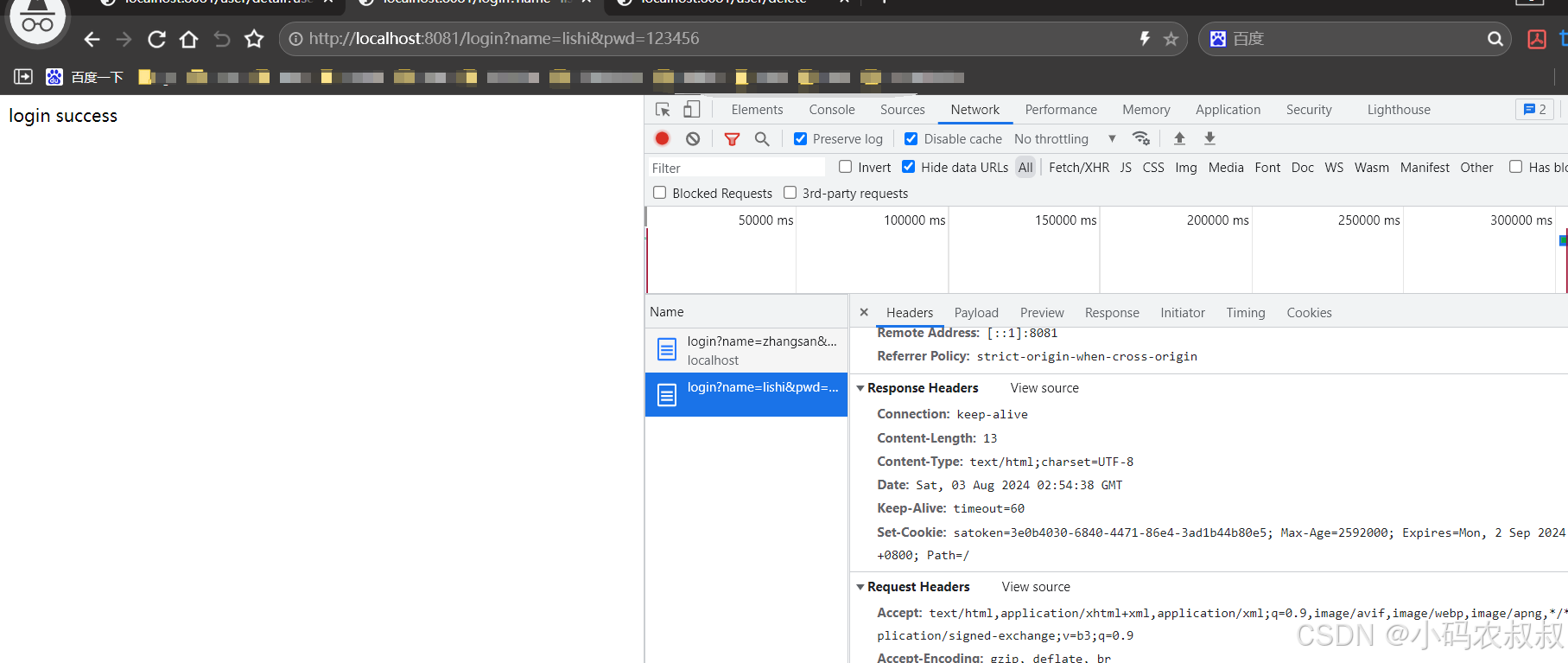 在上述的效果中,通过F12打开浏览器窗口,可以看到,登录成功之后,SA-Token会通过接口响应向浏览器的cookie中写入一些会话相关的信息,比如: