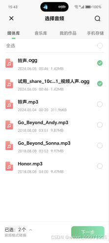 2.选择【音频格式转换】,勾选需要转换的OGG音频(可以在媒体库、音乐库、我的作品、手机存储内选择需要转换的音频)