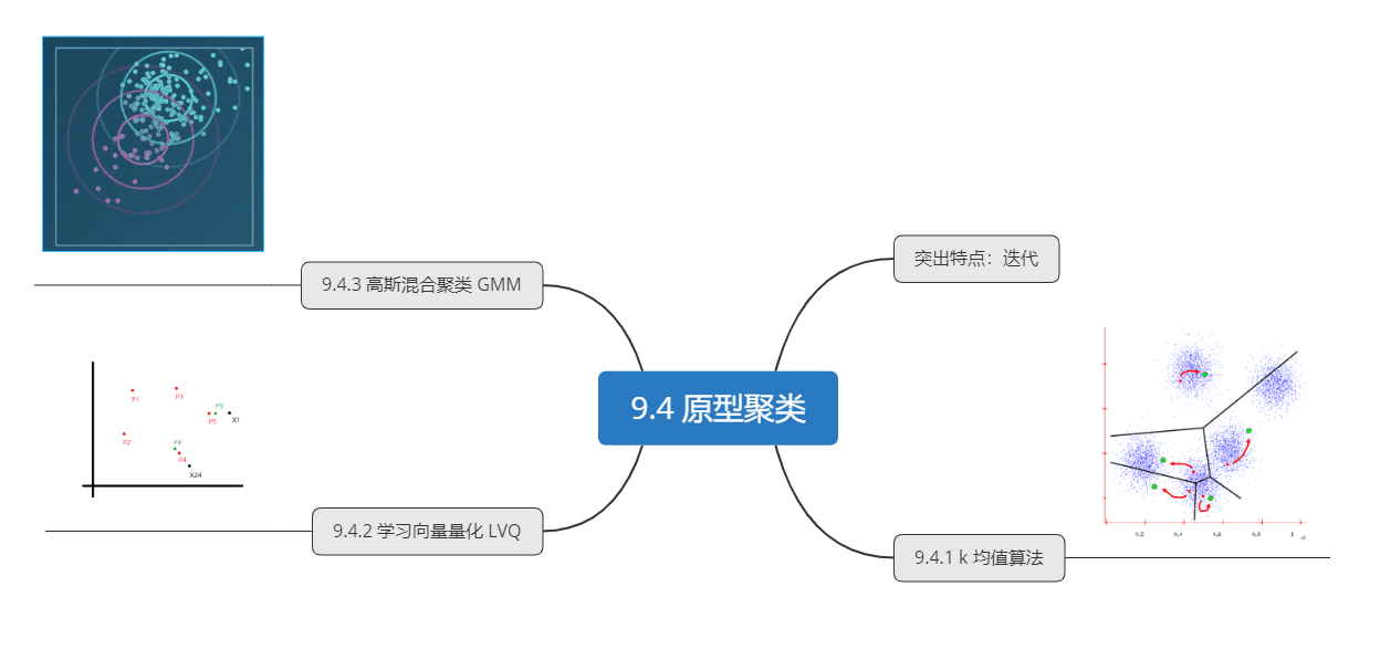 - 输出不是每个簇的划分,而是每个类别的原型向量;
