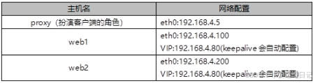 [root@web1 ~]# systemctl stop httpd [root@proxy ~]# curl 192.168.4.80 curl: (7) Failed connect to 192.168.4.80:80; 拒绝连接 [root@proxy ~]# curl 192.168.4.80 curl: (7) Failed connect to 192.168.4.80:80; 拒绝连接 案例要求:使用Keepalived为LVS1、LVS2调度器提供高可用功能,防止调度器单点故障,LVS调度器为用户提供负载均衡的Web服务;