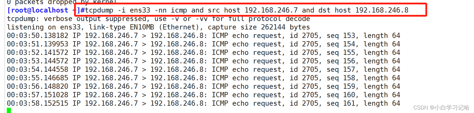 tcpdump -nn -i ens33 icmp and src host 192.168.246.7 and dst host 192.168.246.8