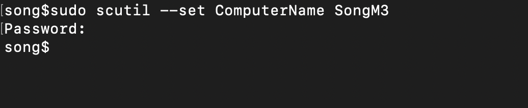 sudo scutil --set HostName xxx xxx为你要修改的名称,根据自己需要输入,修改后退出终端再打开就会刷新成修改后的名称了,下图就是我修改后的终端显示名称: