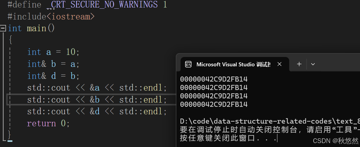 这里的d的地址没变,说明d还是a的别名,d没有指向e,只是把e的值赋给了d。