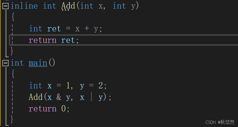 //#define Add(int a, int b) return a + b; //#define Add(a, b) a + b; //#define Add(a, b) (a + b) // 正确的宏实现(宏本质是一种替换)//宏函数坑很多,但是由于替换机制,调用函数时不用建立函数栈帧,能做到提效的作用。#define Add(a, b) ((a) + (b)) // 为什么不能加分号? int main() { int ret = Add(1,2);//这里是将a替换成1,b替换成2;//int ret = Add(1,2);; //在这种场景下不会有问题 cout << Add(1,2) << endl; //如果加分号在这种情况下就会报错,还有下面这种 if(Add(1,2)) { //... } cout << ret << endl; } // 为什么要加外⾯的括号? //有下面这种情况 int main() { int ret = Add(1,2);//这里是将a替换成1,b替换成2;//int ret = Add(1,2);; cout << Add(1,2)*3 << endl; //cout << (1) + (2) * 3 << endl; } // 为什么要加里面的括号? int main() { int x =1,y = 2; Add(x & y ,x | y); // -> (x & y + x | y) }