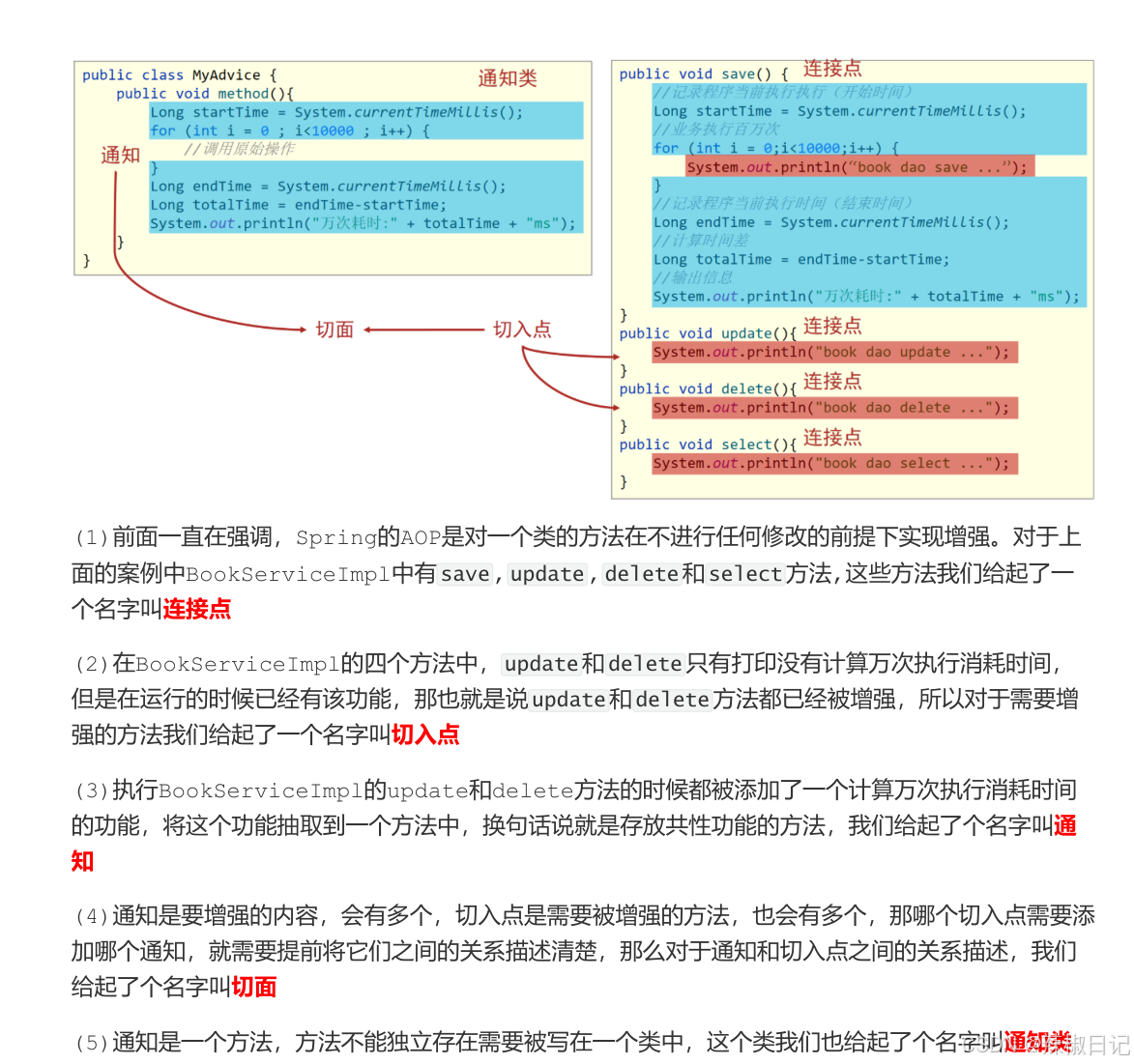 AOP 中的概念: 连接点、切入点、通知、通知类。