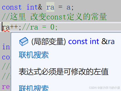 int main() { const int a = 10; //这里对a访问的权限放大 //int& ra = a; const int& ra = a; //这里 改变const定义的常量 //ra++;//ra = 0; int b = 1; const int& rb = b; //const 修饰 引用rb 不能修改常量 //rb++; return 0; }