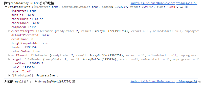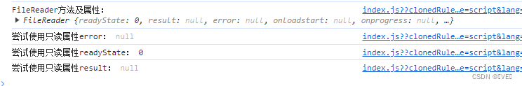 const reader = new FileReader() console.log('FileReader方法及属性:', reader) console.log('尝试使用只读属性error:', reader.error) console.log('尝试使用只读属性readyState:', reader.readyState) console.log('尝试使用只读属性result:', reader.result)