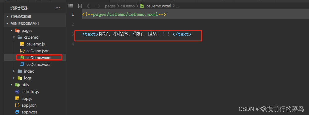 (3)页面创建完成后打开 .wxml页面写下这一行代码。(将之前存在的内容删除)