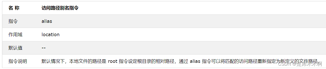 Nginx 中想要配置虚拟目录可以使用 alias 指令,该指令的介绍如下表所示: