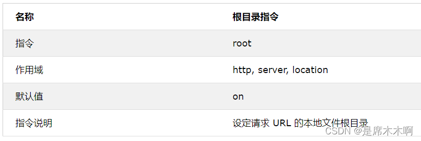 用户请求的最终结果是要返回数据,当响应文件在 Nginx 服务器本地时,需要进行本地文件位置、读或写、返回执行结果的操作。Nginx 中的 root 指令可以设定请求 URL 的本地文件根目录,如下表所示。