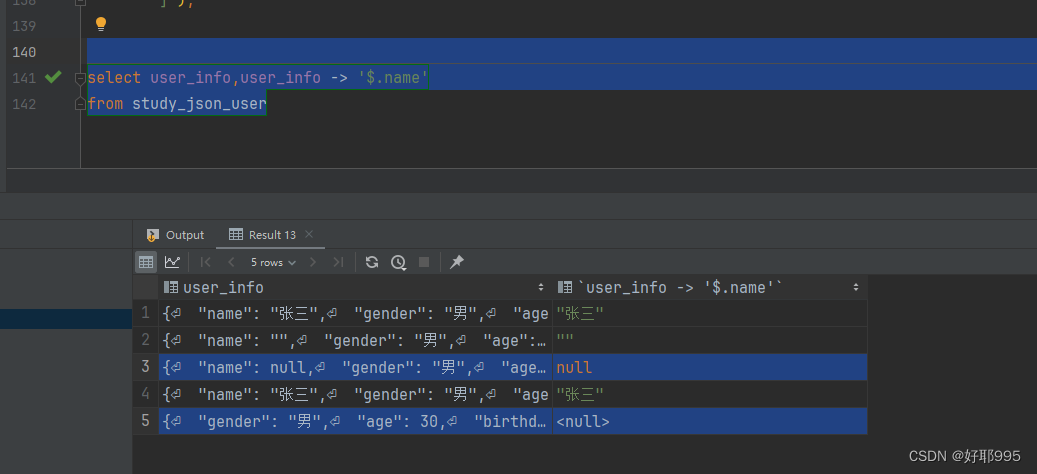 当user_info中的name属性为null时,user_info -> '$.name'得到的值是JSON中的null值。