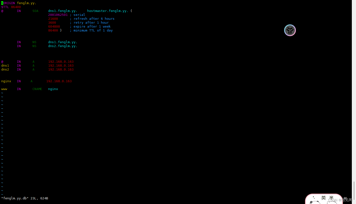 $ORIGIN fenglm.yy. $TTL 86400 @ IN SOA dns1.fenglm.yy. hostmaster.fenglm.yy. ( 2001062501 ; serial 21600 ; refresh after 6 hours 3600 ; retry after 1 hour 604800 ; expire after 1 week 86400 ) ; minimum TTL of 1 day IN NS dns1.fenglm.yy. IN NS dns2.fenglm.yy. @ IN A 192.168.0.163 dns1 IN A 192.168.0.163 dns2 IN A 192.168.0.163 nginx IN A 192.168.0.163 www IN CNAME nginx 修改后如下图所示