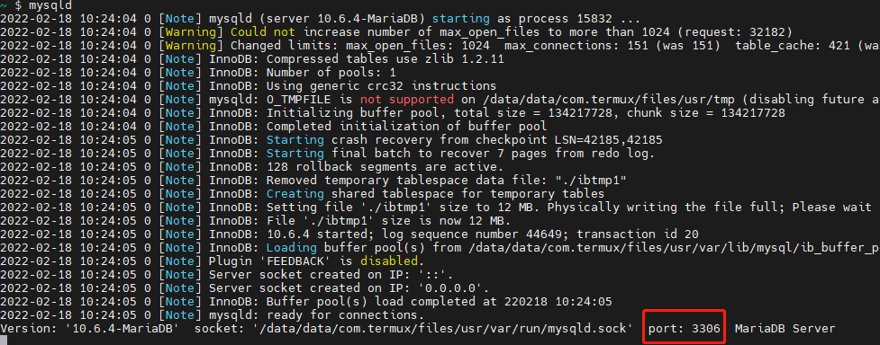 # 安装mariadb pkg install mariadb; # 卸载mariadb pkg uninstall mariadb # 关停mariadb pkill mariadb