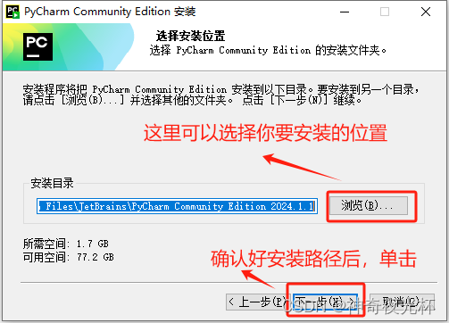 (我的安装路径:E:\Program Files\JetBrains\PyCharm Community Edition 2024.1.1,切勿装在C盘中)