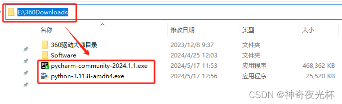 找到上面下载的pycharm-community-2024.1.1安装程序(注:我的在E:\360Downloads\下面,请根据自己下载路径查找),如下图: