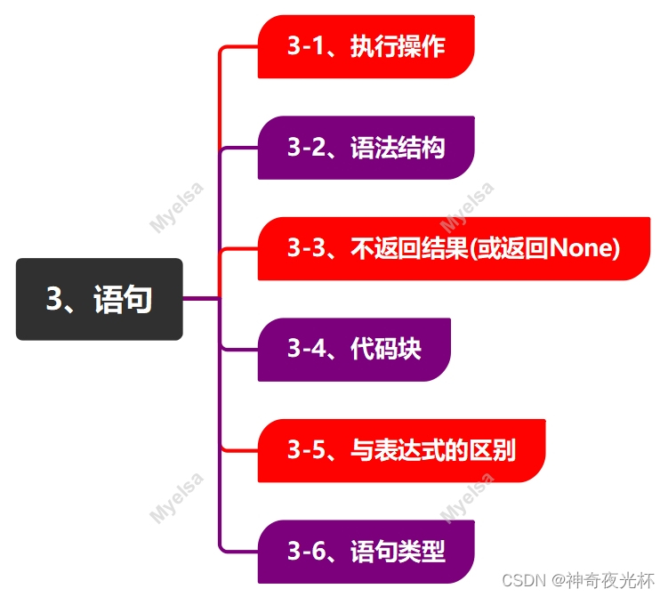 3-6、语句类型:Python中有多种类型的语句,包括赋值语句、条件语句(如if语句)、循环语句(如for和while循环)、导入语句(如import语句)、函数定义语句、类定义语句等。