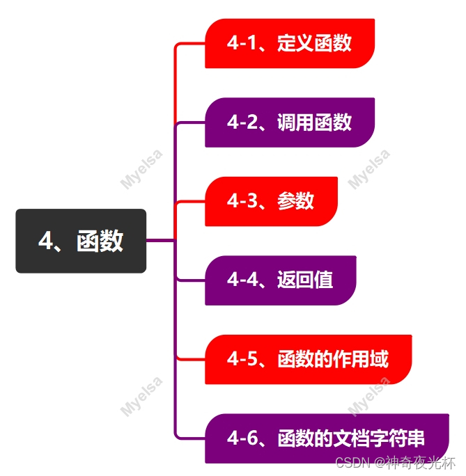 4-5、函数的作用域:函数内部定义的变量是局部变量,它们只在函数内部可见,函数外部定义的变量是全局变量,它们在函数外部和函数内部都可见(但在函数内部可能会被局部变量覆盖)。