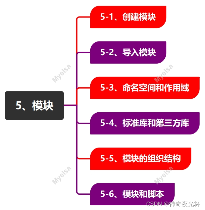 5-1、创建模块:模块就是一个`.py`文件,其中包含了Python代码,你可以将相关的函数、类和变量定义在同一个模块中,以便在其他地方重复使用。