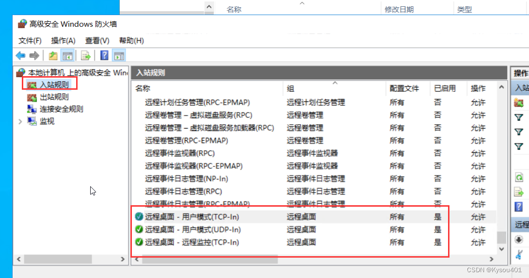 第二步:在入站规则中放行远程桌面;