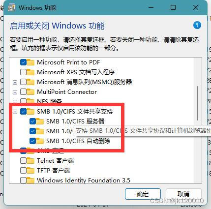 将SMB1.0/CIFS文件共享支持前面的勾 打上,然后确定-重启电脑就可以了。