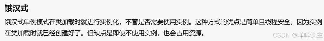 注意,实例已经在类中被创建,所以叫饿汉=迫不及待需求对象