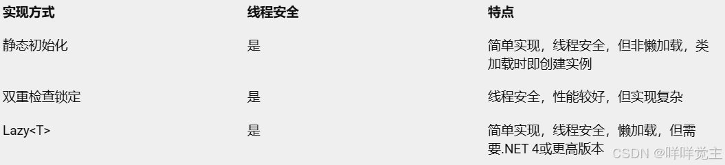 public class A where T :new() { //1.私有静态唯一实例 private static Lazy instance = new Lazy(() => new()); //2.公共外部属性 public static T Instance => instance.Value; //3.私有构造函数 private A() { } }