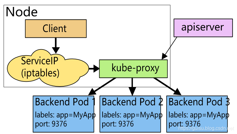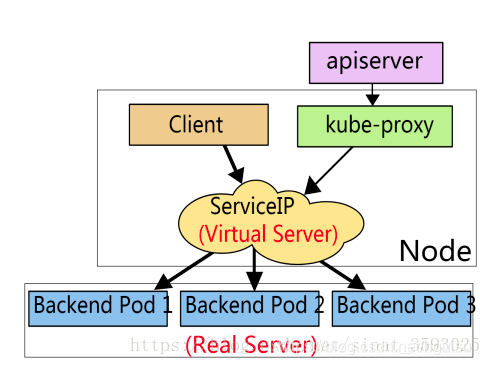 client先请求serviceip,经由iptables转发到kube-proxy上之后再转发到pod上去。这种方式效率比较低。