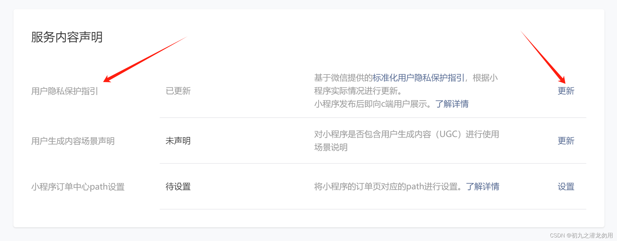 在提交代码审核的时候,可能还需要设置用户隐私保护指引,其目的是为了规范开发者的用户个人信息处理行为,保障用户合法权益。