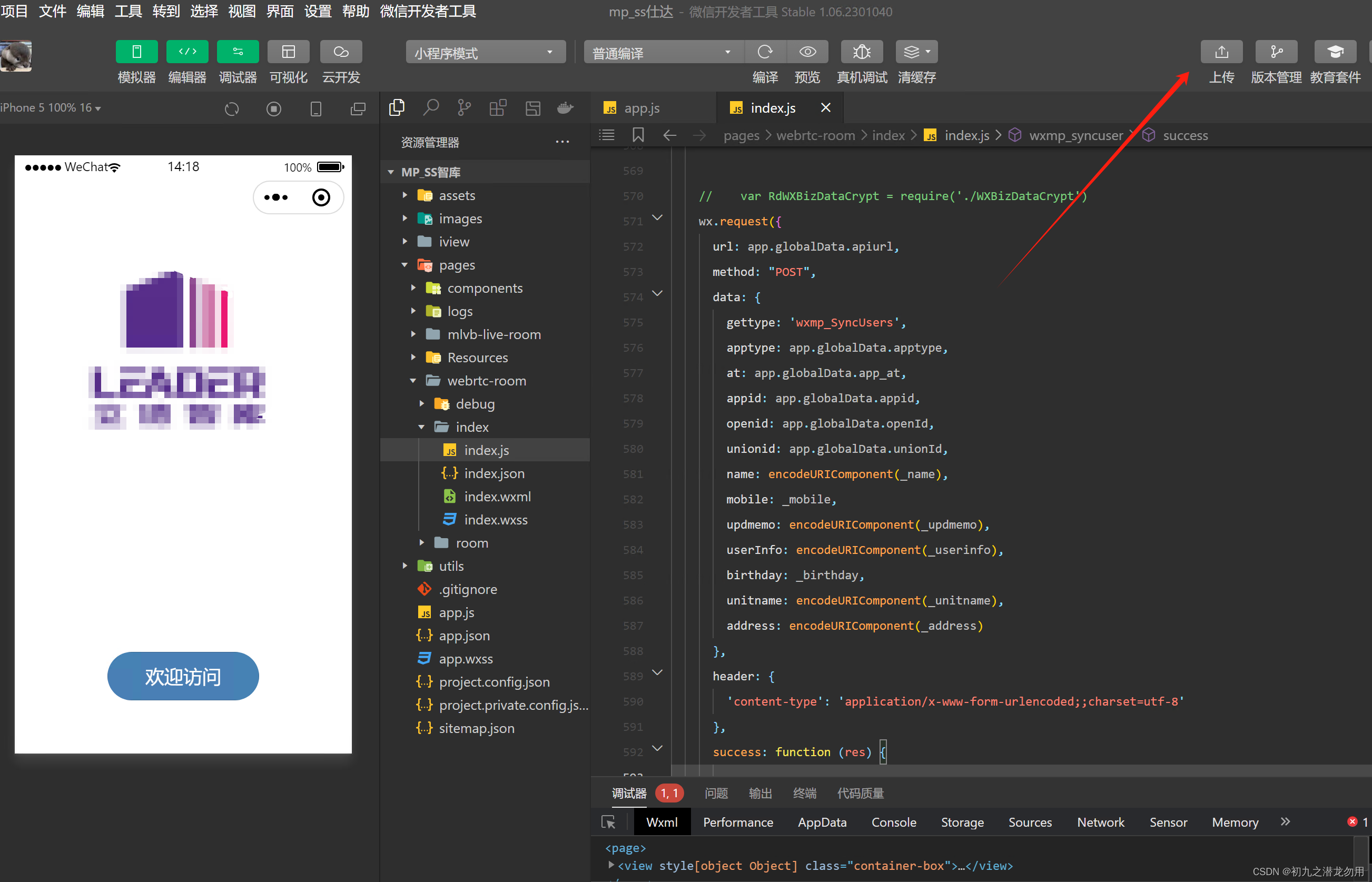 如图输入项目名称,选择源程序所在目录,注意一定要输入正确的 AppID ,后端服务可不使用云服务。进入IDE环境,我们就可以进行小程序的开发了,开发完成,可选择上传功能到平台。如下图所示: