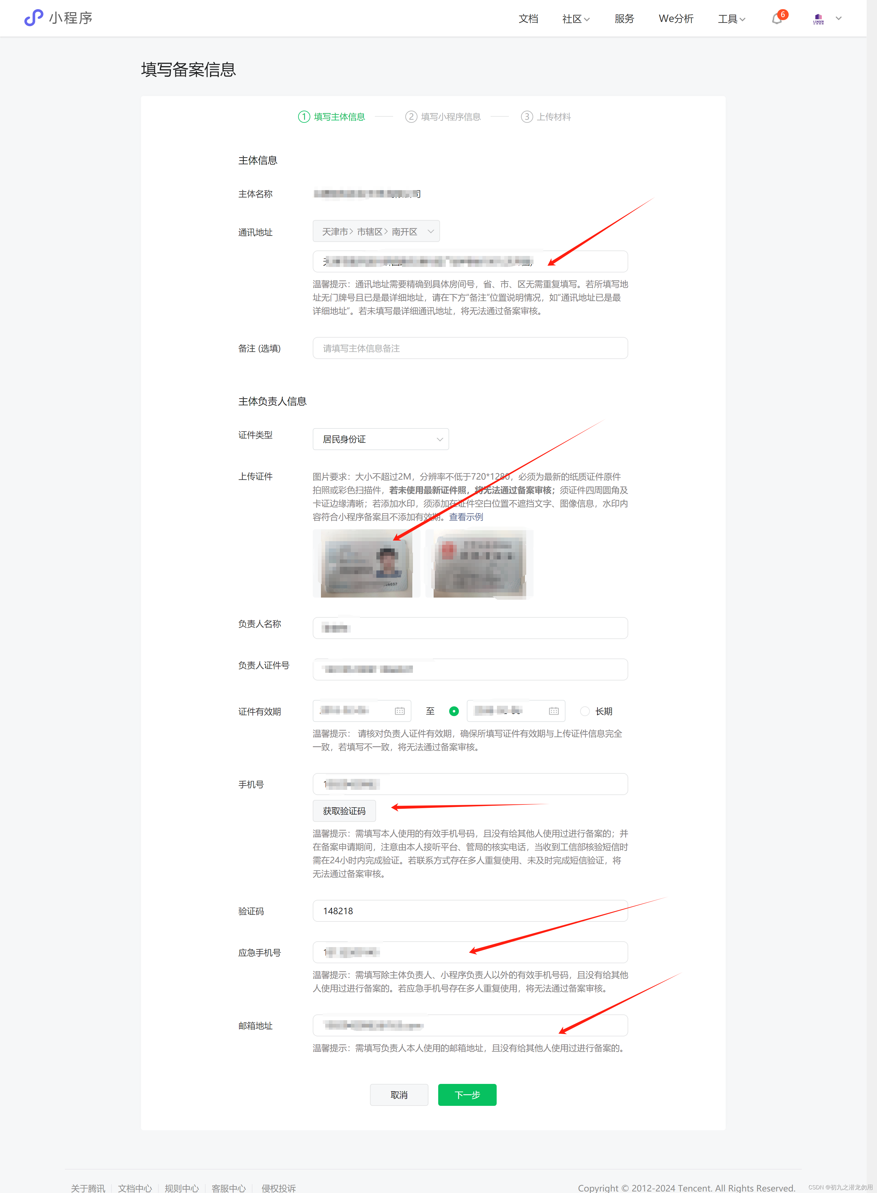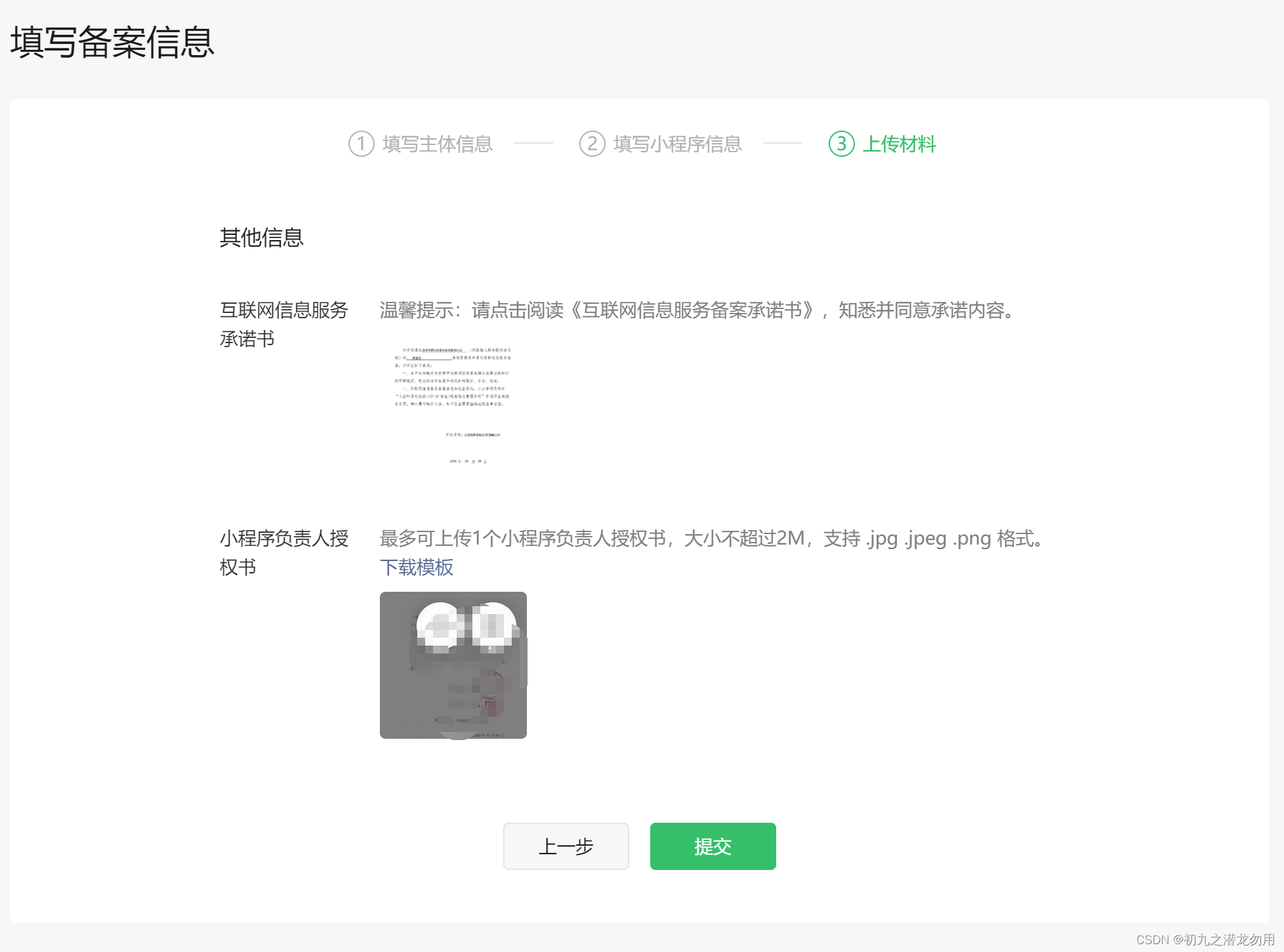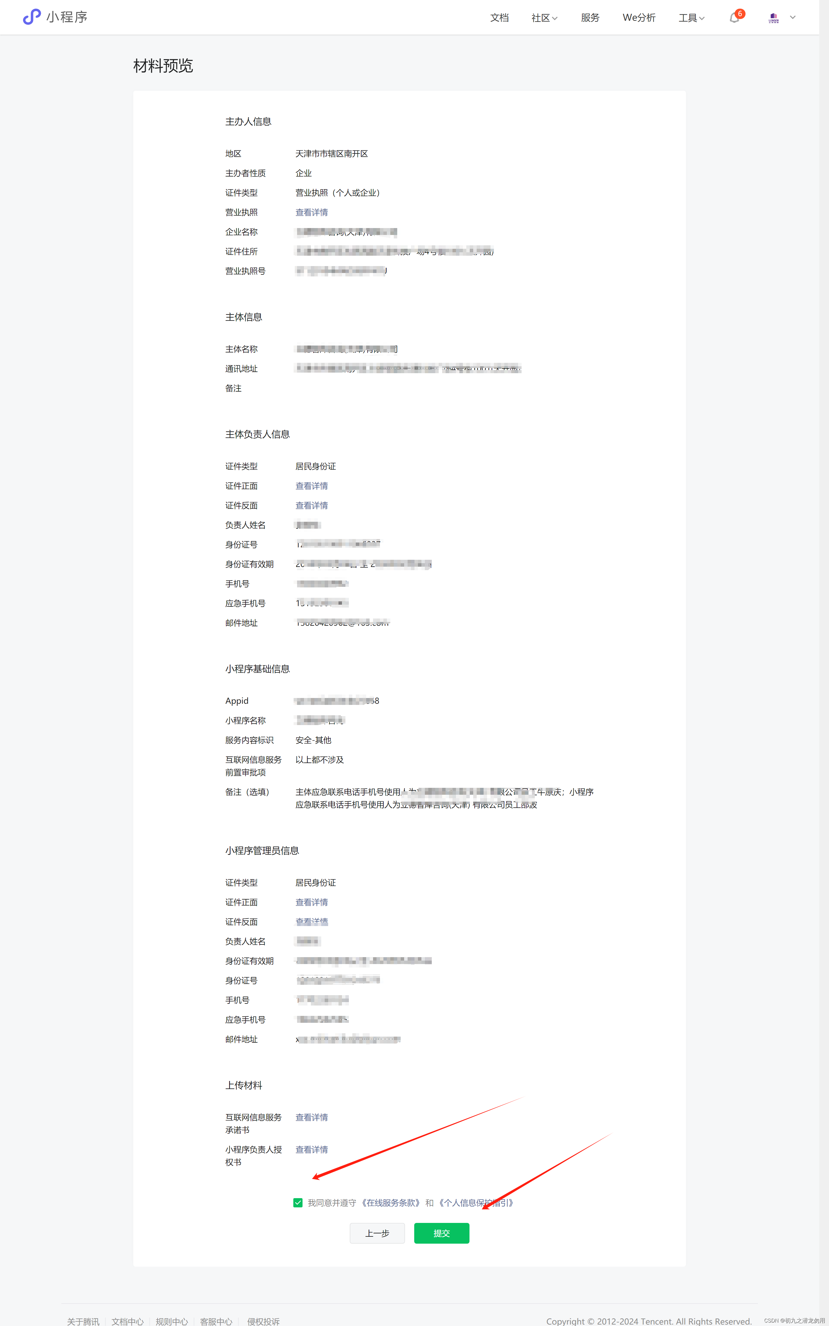 请下模板,填写小程序负责人姓名、身份证号及法人身份证号信息,然后加盖公司章、法人章,并点击提交按钮。最后会生成材料预览,如下图: