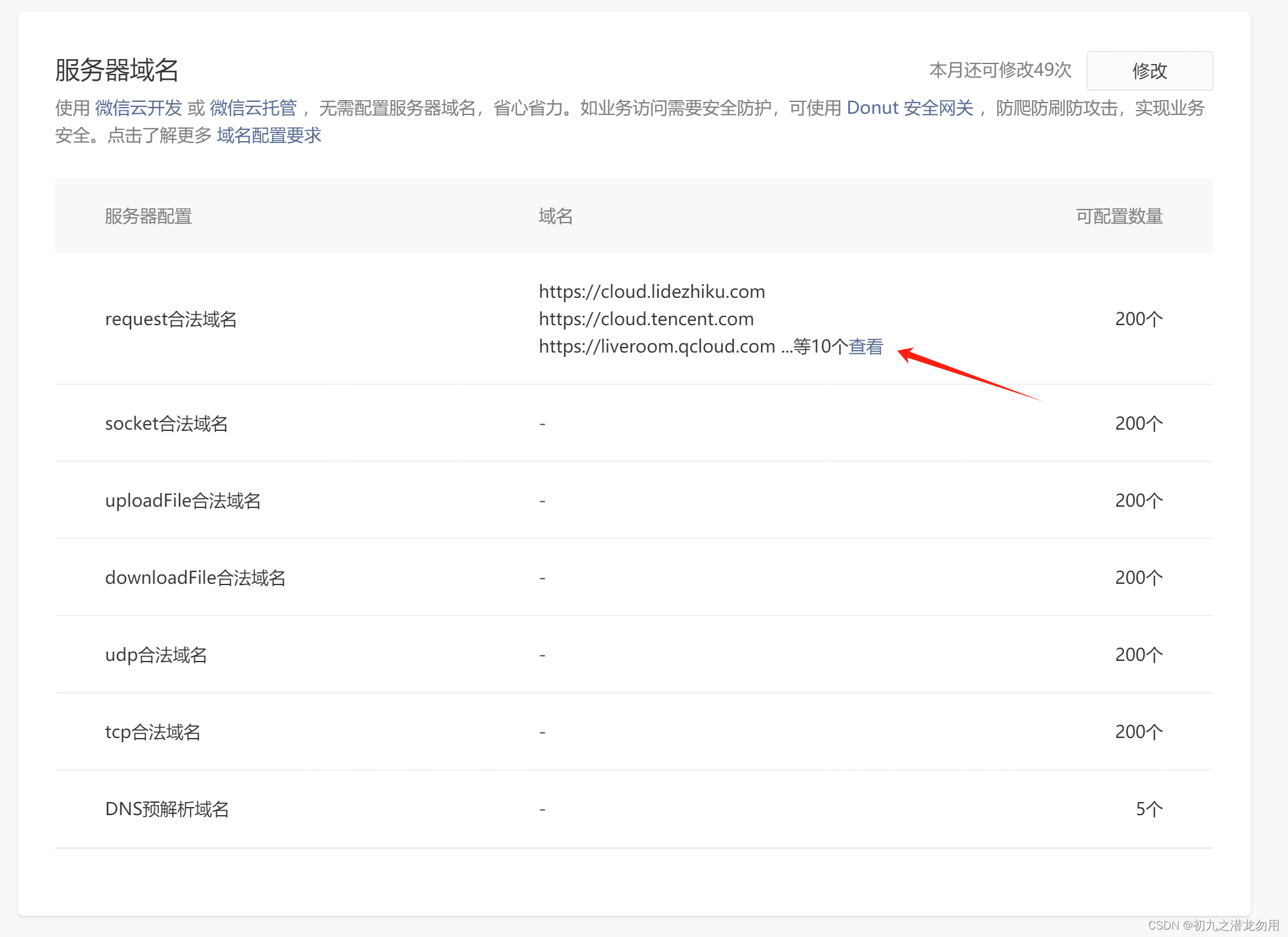 继续滚动界面到服务器域名如下图,请至少设置 request 合法域名,多个域名设置的时候用分号分隔。