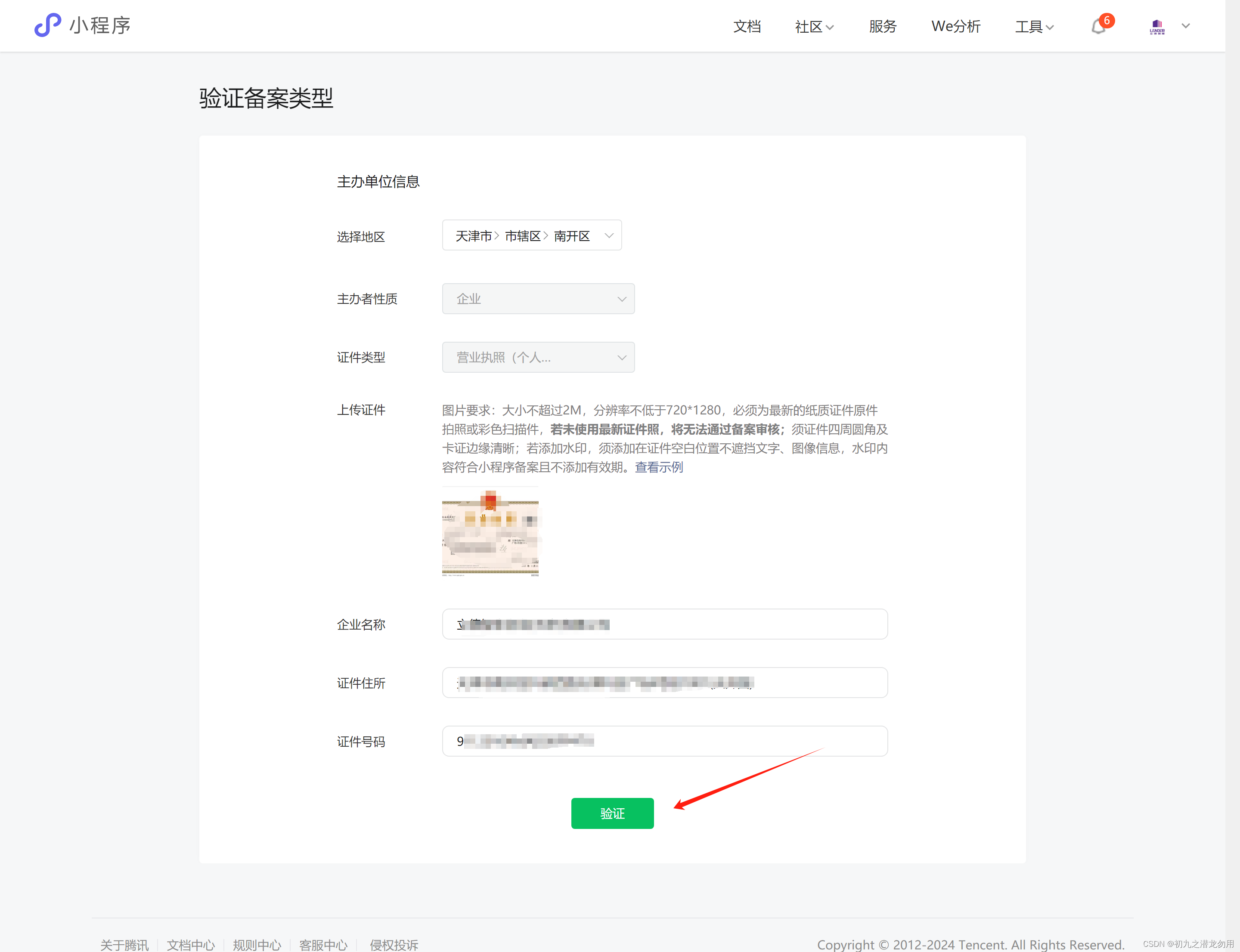 请选择单位所在地区,上传营业执照电子图片,成功后企业名称、证件住所、证件号码会自动识别,下一步点击“验证”按钮,如下图所示: