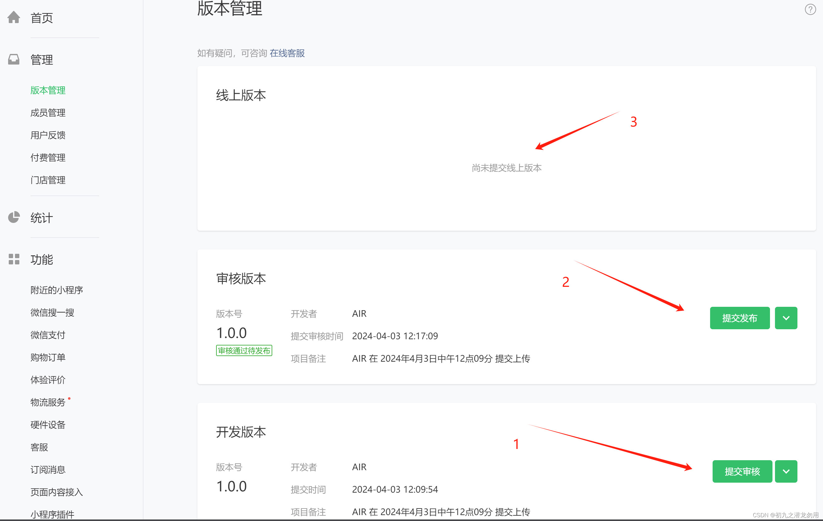 第 3 阶段:线上版本即为审核版本提交发布后的显示,请注意,新进的小程序则必须通过备案才可以提交发布。