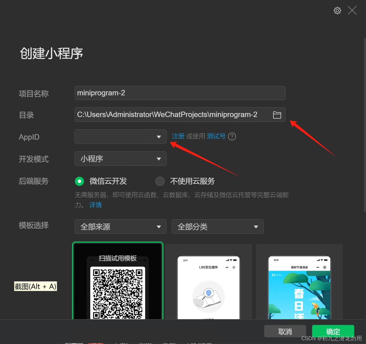 选择需要的版本即可,安装后,打开应用程序,新建小程序项目,如下图: