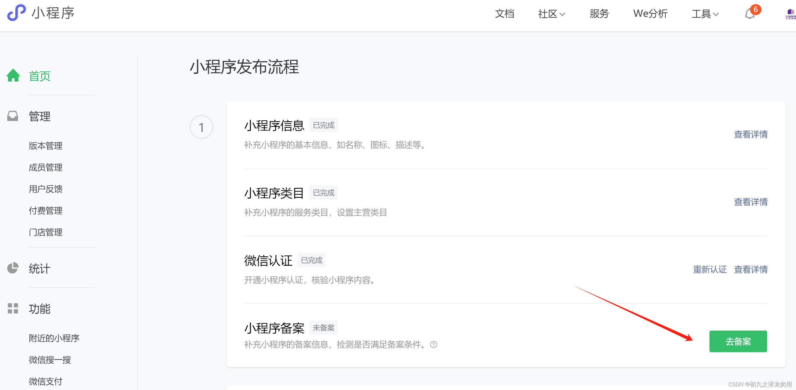 扫码在手机端选择您管理的小程序,登录后如下图,在完善小程序信息、小程序类目、微信认证后,请点击小程序备案,“去备案”按钮。