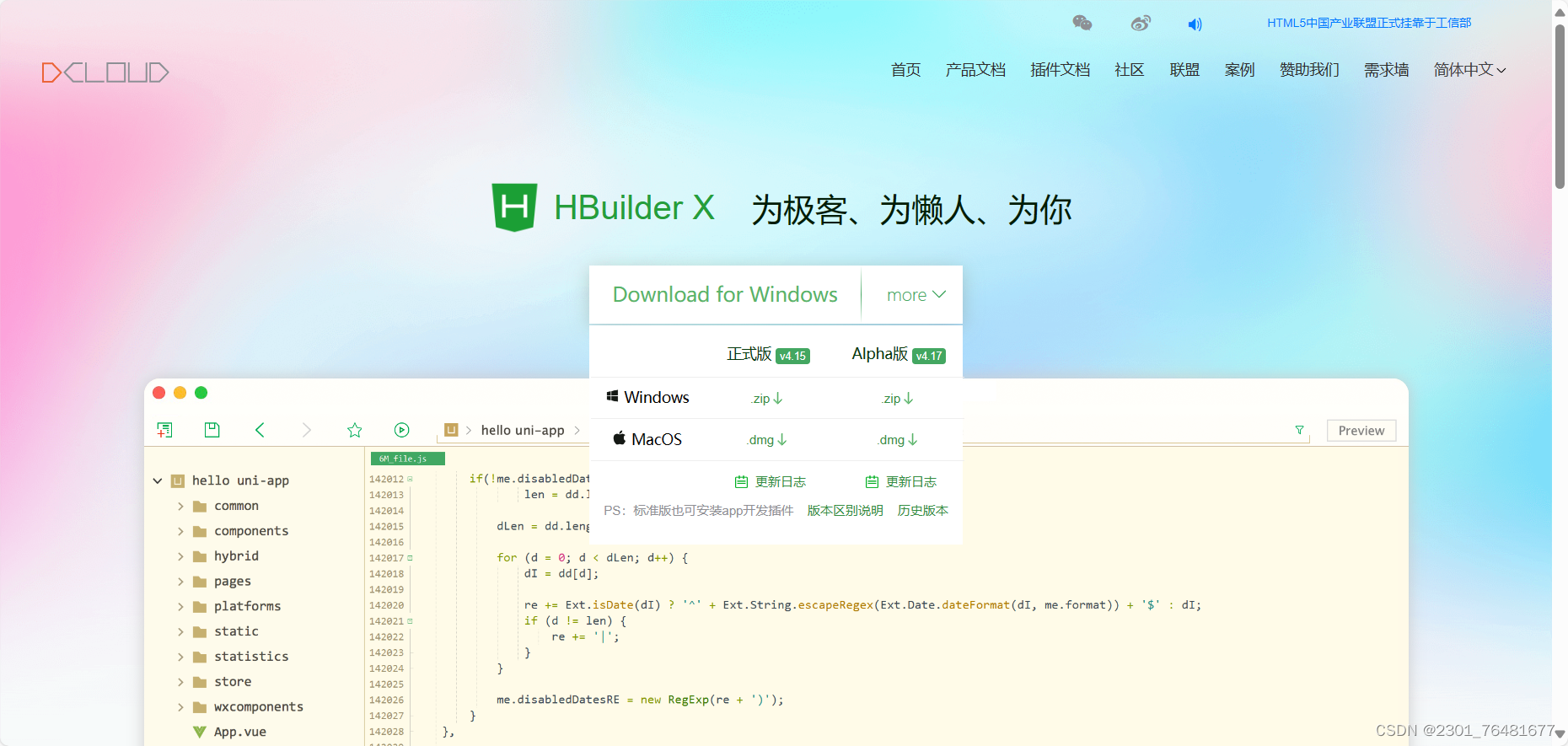 1.下载HBuilderX,官方地址:点击进入,选择正式版下载安装