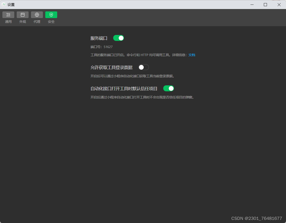 在进行微信小程序登录之前,我们需要先在微信开发者平台进行相关配置。首先,在“开发”->“开发设置”->“开发者工具”中,将“服务端口”开启,并填入自己的IP地址。