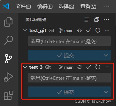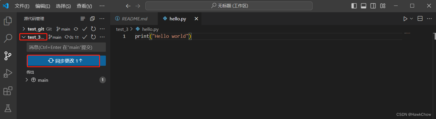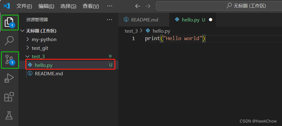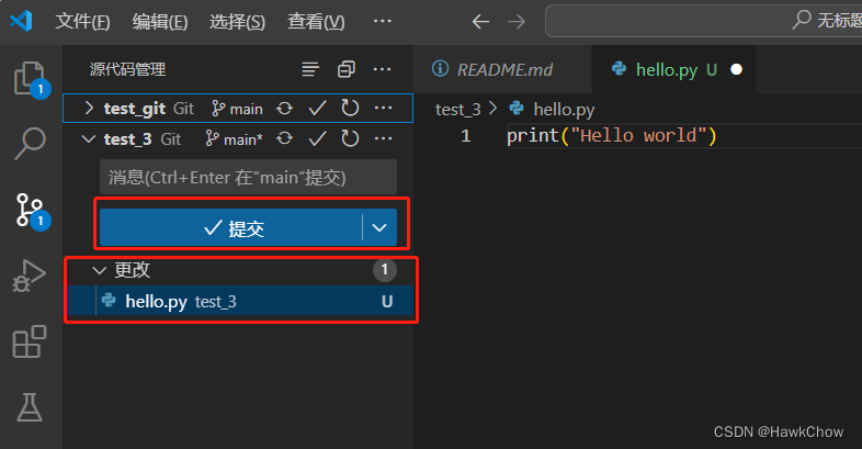 1)在本地仓库“test_3”的文件夹下,新建代码文件hello.py,“源代码管理”和“资源管理器”里显示更新内容,在“源代码管理”里点击“提交”,即可将本地更新内容推送到github